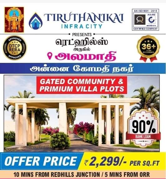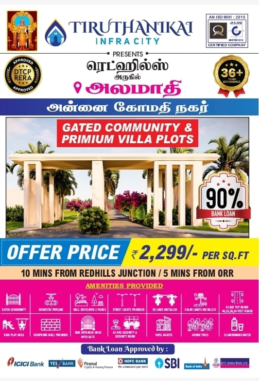 DTCP approved villa plots near Redhills outer ring road Chennai developed by Tiruthanighai Real Estates with all amenities like childern park, electricity, water connection to all houses.